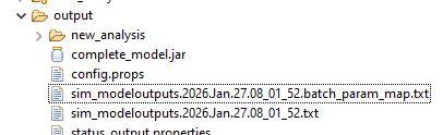- The files are named sim_modeloutputs.datetime.txt and sim_modeloutputs.datetime.batch_param_map.txt. The first file is the output data for each iteration, and the batch_param_map is the set of parameters that ran on each iteration. Then can be joined on the “run” column.