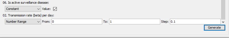 - The Batch Parameters tab is used to set up the parameters that will be used for this batch. Note that the Transmission Rate parameter is set to sweep from 0 to 1 with a step of 0.1. This will yield 11 runs, one at each step specified (inclusive of start and end values).