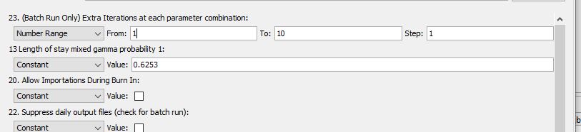 Batch mode is used for calibration, validation and experimentation. We can make many iterations of the data without changing any parameters so that we can examine the distribution of the stochastic outputs. We can also choose one or more parameters to sweep across a range or list of values so we can observe the sensivity of the outputs to changes in the inputs.