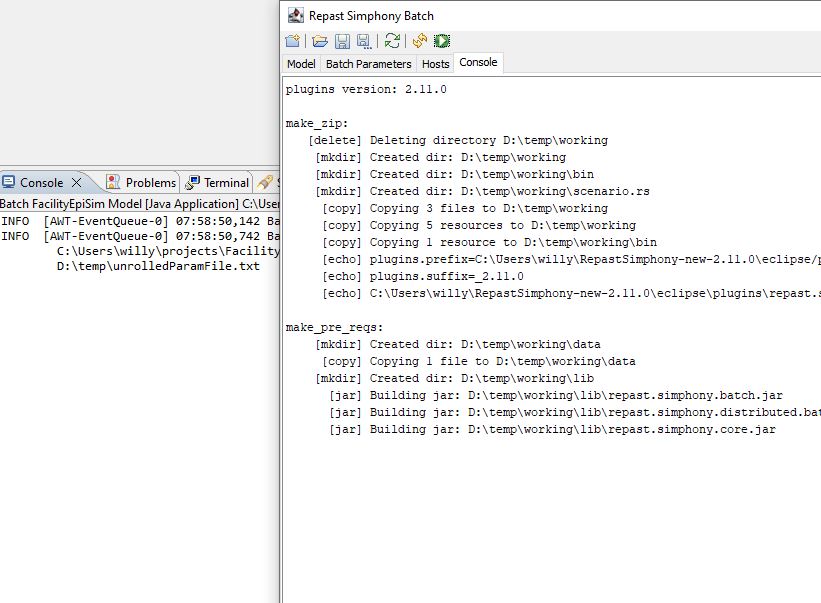 - Click the green run button, and you’ll see the batch interface and the Repast console start to print information. Much of it is output from the individual iterations, that we use to make sure things haven’t stalled errored out.
