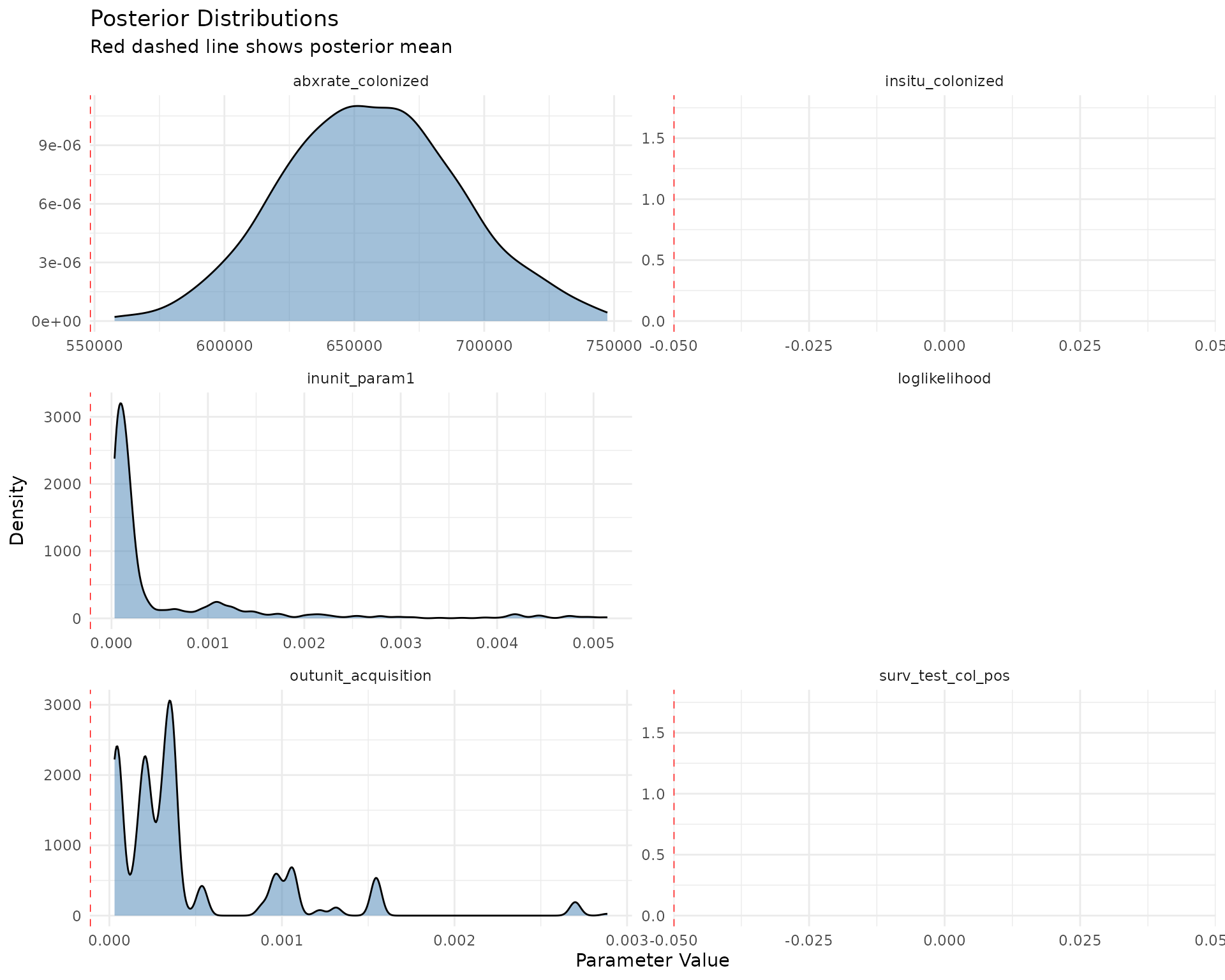 Posterior distributions show the estimated distribution of each parameter after the MCMC sampling.
