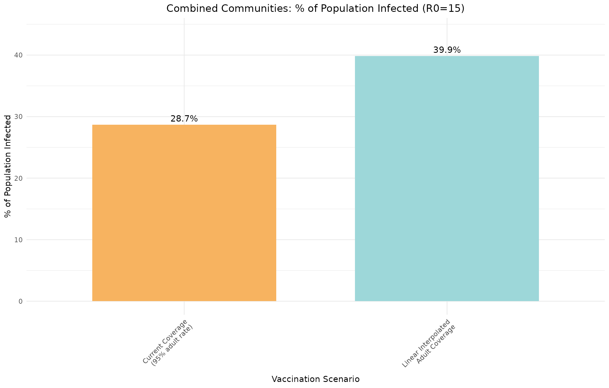#> suggesting that aggregating the populations provides a more stable epidemic profile.Scenario 2: Linear Interpolation of Adult Vaccination Rates