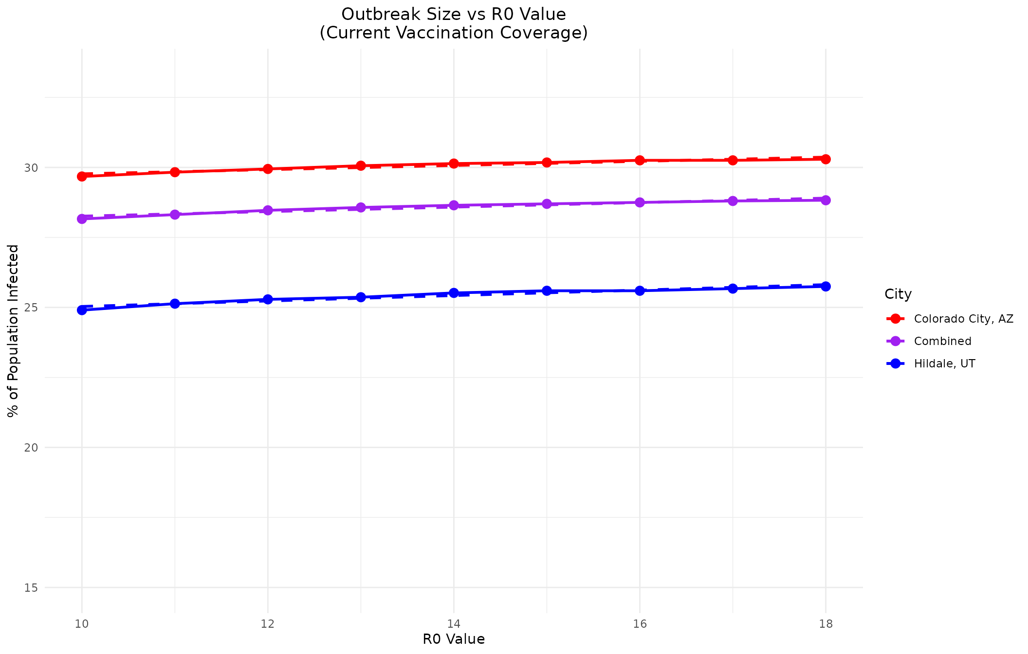 #> The combined population shows the most gradual increase in outbreak size with R0,